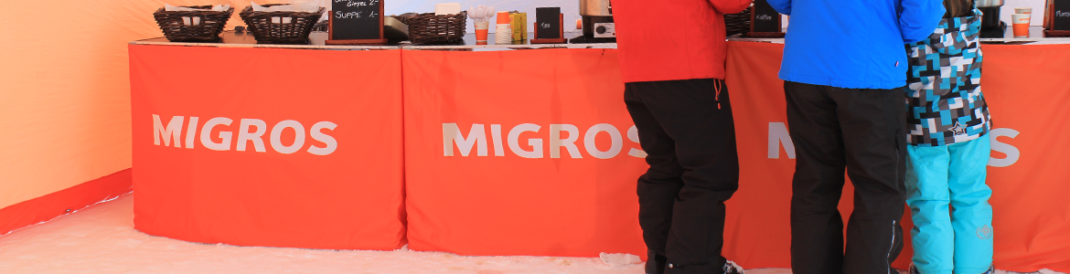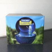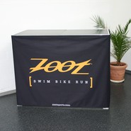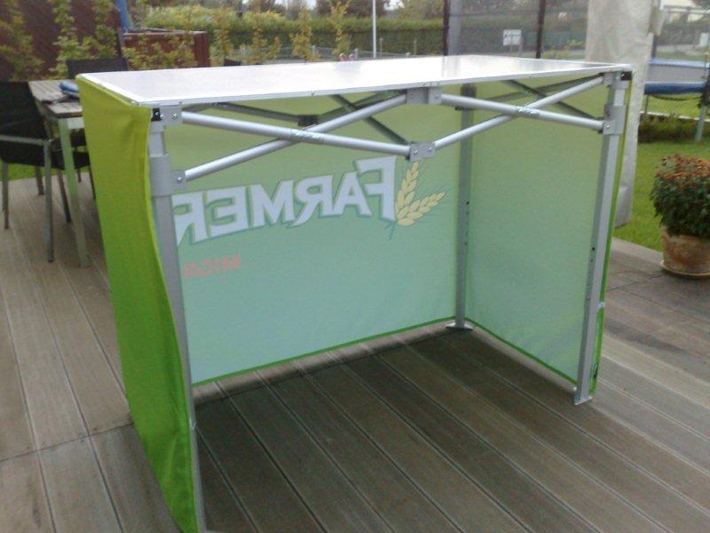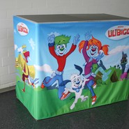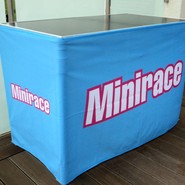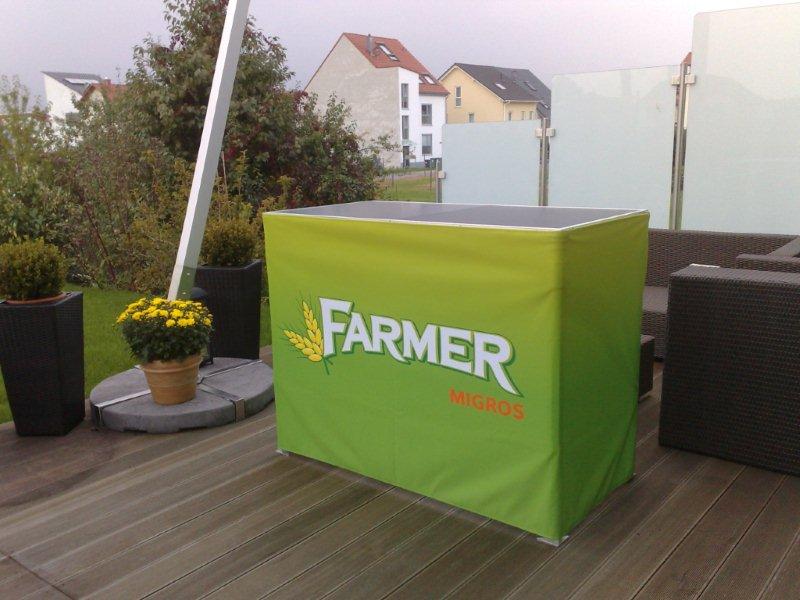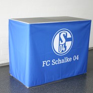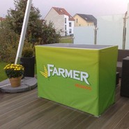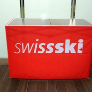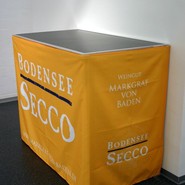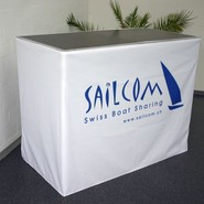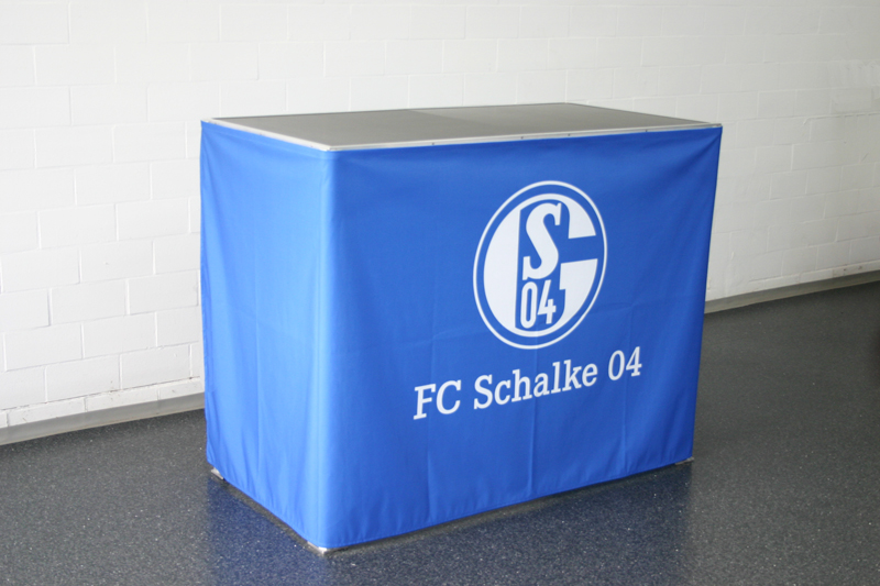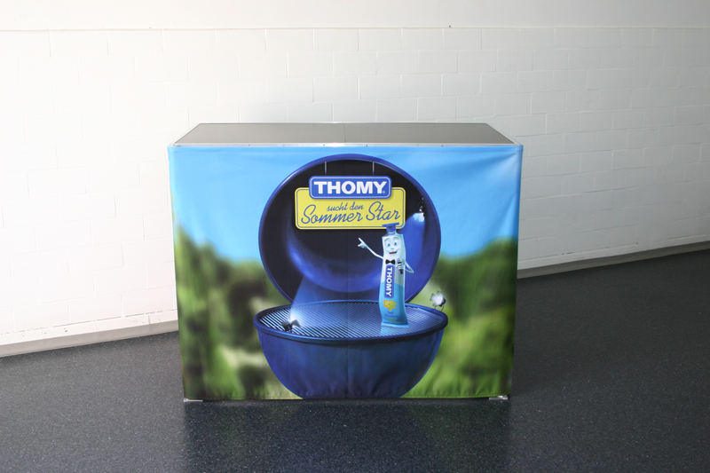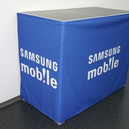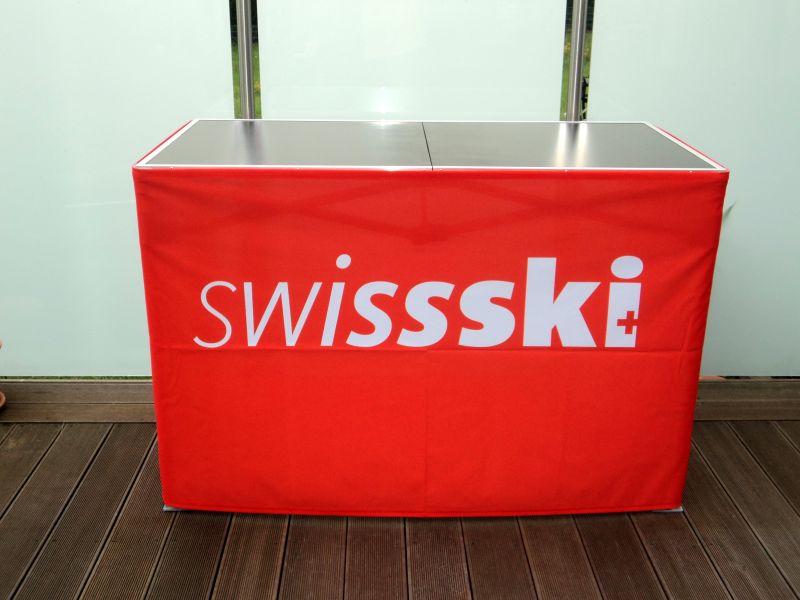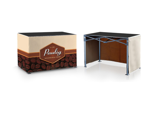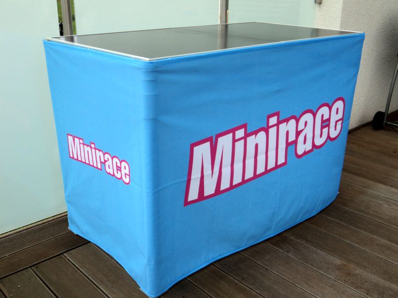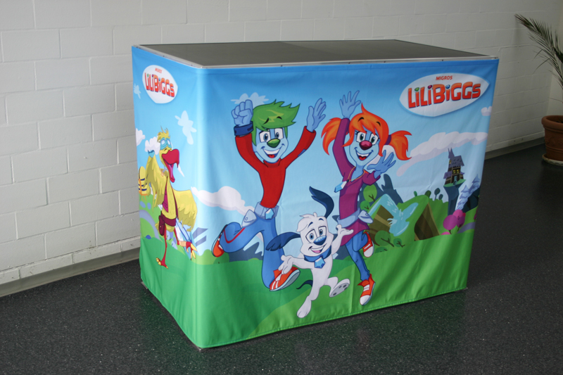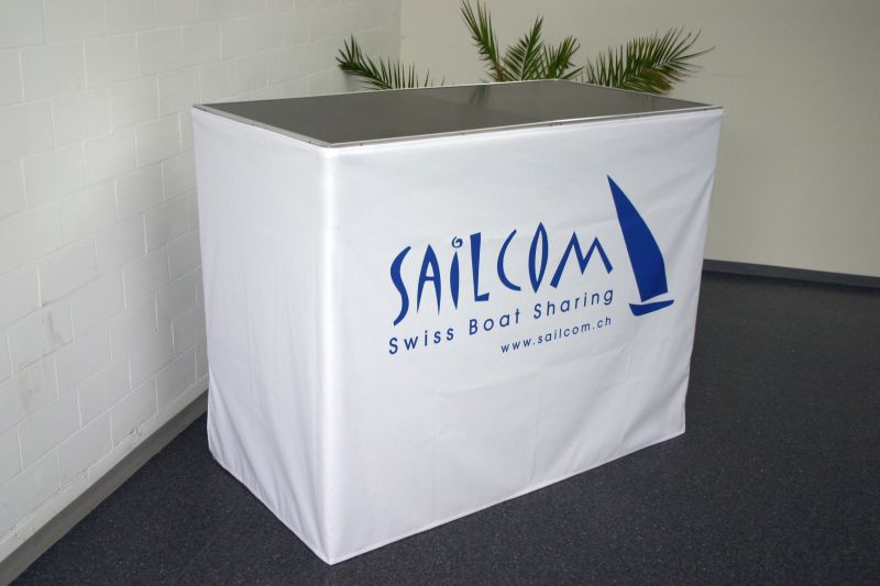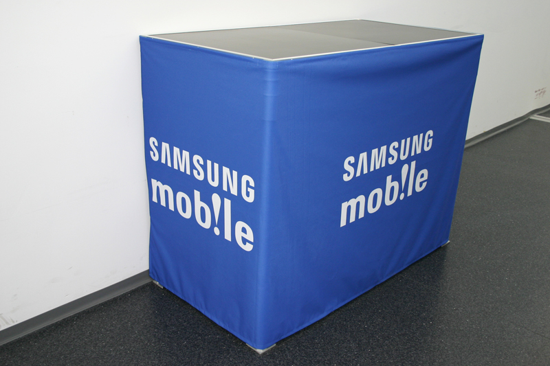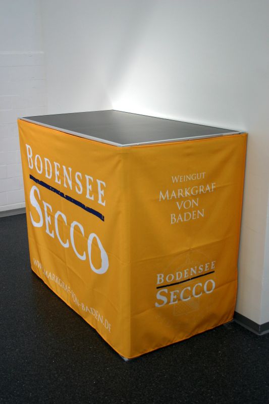 Für Branding und Promotion kann das Tischgestell mit einer Bespannung aus schwer entflammbaren (B1) Polyester bestückt werden. Die Bedruckung kann vollflächig in digitalem Sublimationsdruck erfolgen.
