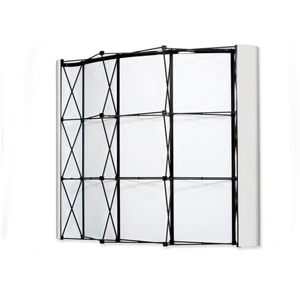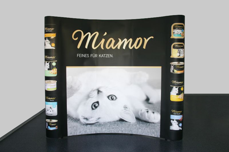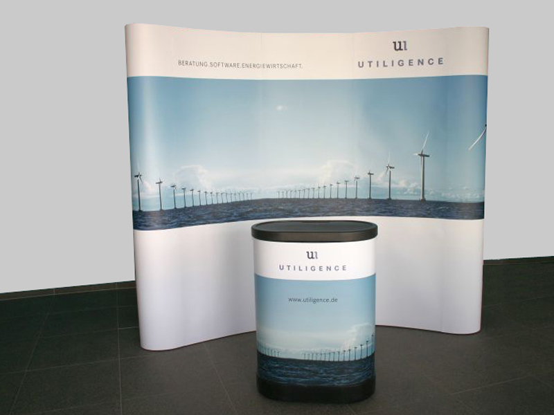 Die Systeme sind extrem stabil, formschön und aufgrund der Leichtbauweise einfach zu transportieren. Die einzelnen Druckbahnen lassen sich über Magnetstreifen leicht an den einzelnen Feldern der Faltkonstruktion anbringen. Dadurch kann das Bildmotiv einfach und kostengünstig durch ein anderes ausgetauscht werden. Im Lieferumfang sind neben dem Faltwandgestell inkl. Magnetschienen und Druckbahnen auch ein Hardcase-Transportkoffer und zwei Halogenstrahler enthalten. Der Transportkoffer kann als Präsentationstisch (Counter) verwendet werden.