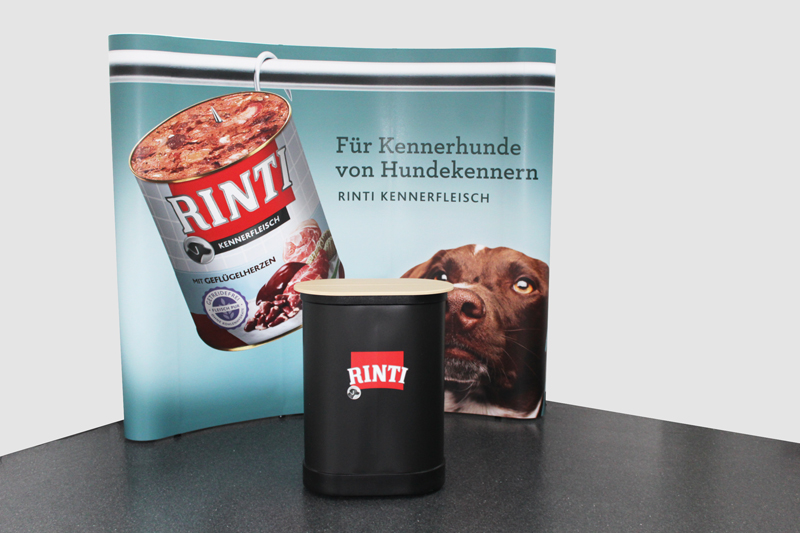 Optional sind für den Counter eine Abdeckplatte und eine Grafikpaneele erhältlich. Die offene Rückwand der Faltwand kann ebenfalls durch eine optional erhältliche Garfik-Paneele geschlossen werden.