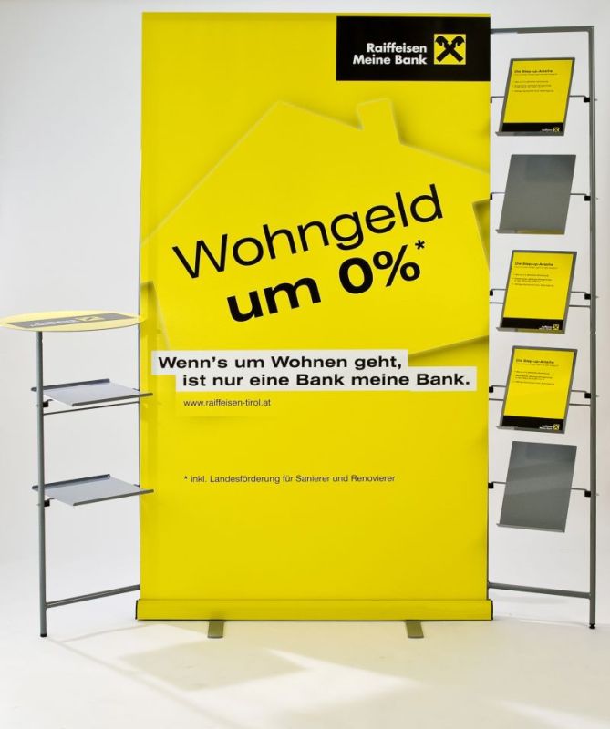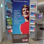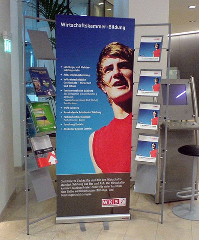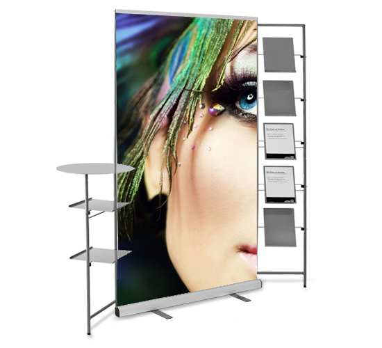Erhältlich in verschiedenen Breiten von 60 cm bis 250 cm - jeweils 215 cm hoch - erfüllt es auch höchste Ansprüche an die Flexibilität. Die zahlreichen, variablen Module - vom Prospektständer, über den Stehtisch bis hin zum Mediacenter mit LCD-Display und Mediabox - erfüllen jeden Wunsch an die moderne Präsentation vor Ort.